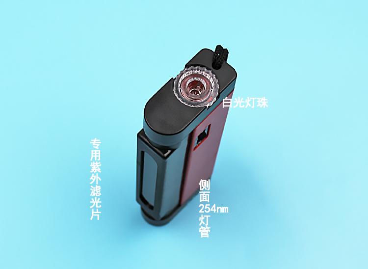 手持紫外線燈254nm,可用于檢測玻璃正反面(錫面與非錫面)的,其原理是利用紫外線的短波在玻璃中的反射原理來檢測錫面與非錫面,錫面是在燈光照射下顯現(xiàn)出白色或乳白色,而非錫面則不顯示顏色。